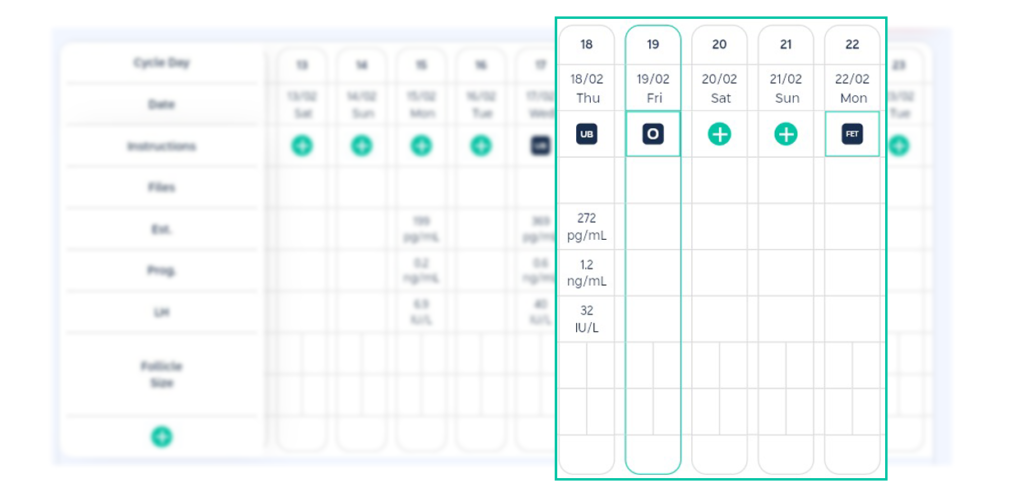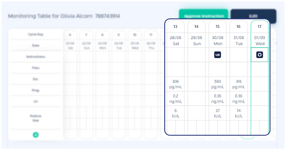Manage the entire natural IUI process, including blood and ultrasound analysis, test day instructions, and ovulation detection. Our AI technology detects ovulation on dates -2/-3 to help clinician choose the correct insemination date.